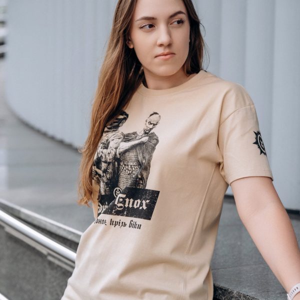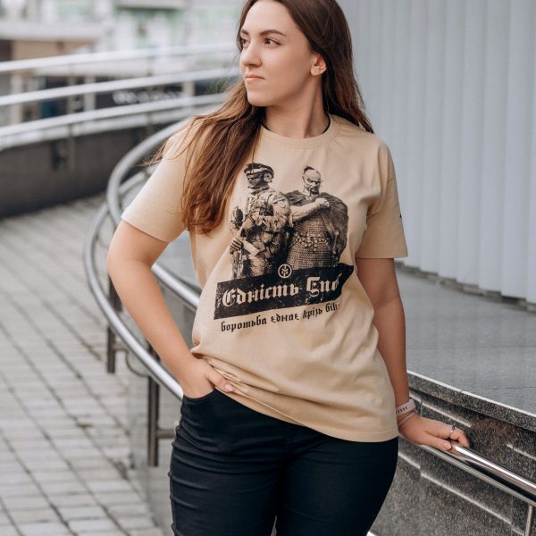 Футболка унісекс трикотажна вільного крою, рукав короткий, на грудях термодрук. «Єдність епох. Боротьба єднає крізь віки» — це гасло нагадує, що ми несемо в собі силу наших предків, і їхні перемоги стають нашим джерелом натхнення. Футболка має глибоке символічне значення.... показати повністю